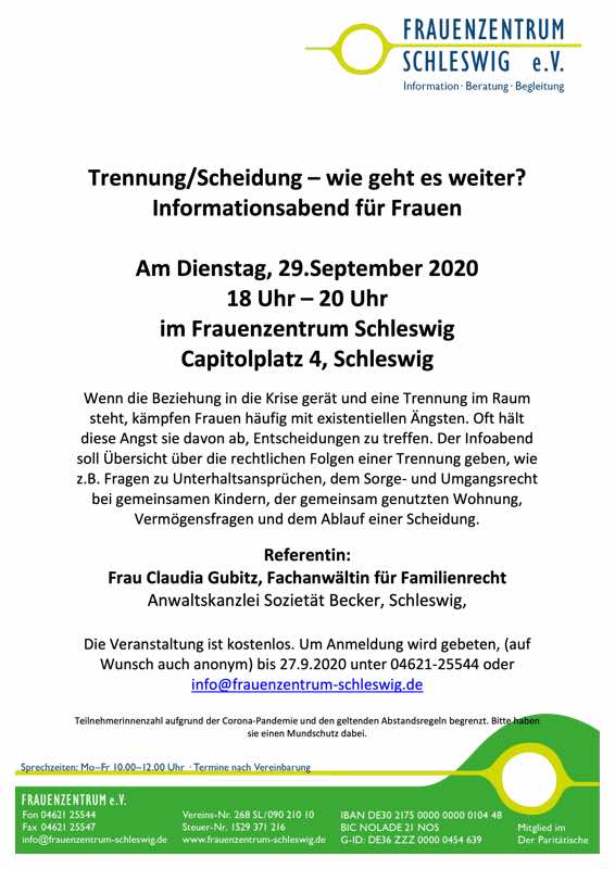 Wenn die Beziehung in die Krise gerät und eine Trennung im Raum steht, kämpfen Frauen häufig mit existentiellen Ängsten. Oft hält diese Angst sie davon ab, Entscheidungen zu treffen. Der Infoabend soll Übersicht über die rechtlichen Folgen einer Trennung geben, wie z.B. Fragen zu Unterhaltsansprüchen, dem Sorge- und Umgangsrecht bei gemeinsamen Kindern, der gemeinsam genutzten Wohnung, Vermögensfragen und dem Ablauf einer Scheidung.