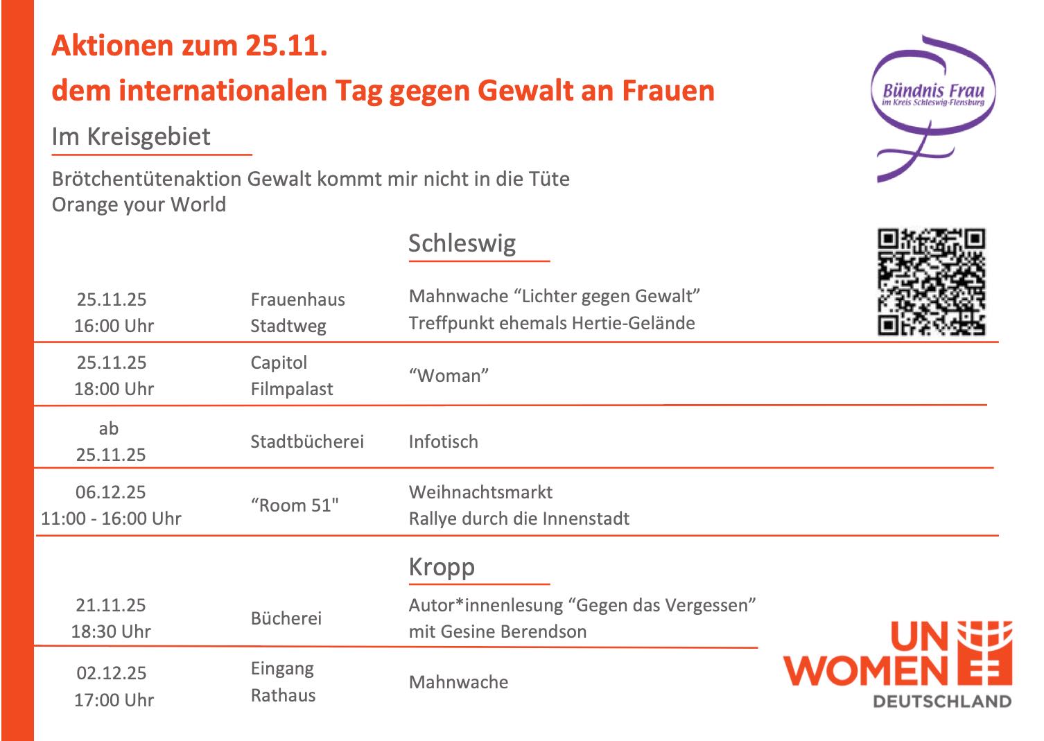 Am 25. November findet in Schleswig um 16:00 Uhr eine Mahnwache „Licher gegen Gewalt“ (Treffpunkt: Ehemaliges Hertie-Gelände) statt und um 18:00 Uhr wird im Capitol Filmpalast der Film „Woman“ gezeigt. Ein Weihnachtsmarkt im Room 51 mit anschließender Rallye durch die Innenstadt findet am 6. Dezember von 11:00–16:00 Uhr statt.