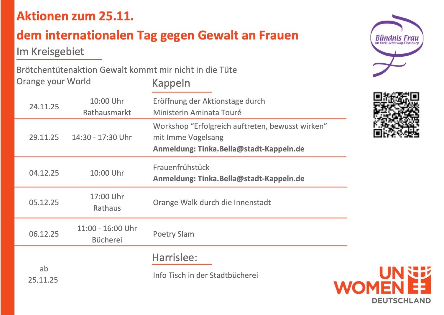 Vom 25. November bis zum 10. Dezember 2025 beteiligt sich die Stadt Schleswig und Umgebung an der UN-Kampagne „Orange the World“, die seit 1991 auf Gewalt gegen Frauen und Mädchen aufmerksam macht. Die Aktion beginnt am Internationalen Tag zur Beendigung der Gewalt gegen Frauen am 25. November und endet am Tag der Menschenrechte am 10. Dezember. Ziel der Kampagne ist es, weltweit ein sichtbares Zeichen für eine Zukunft ohne Gewalt zu setzen.